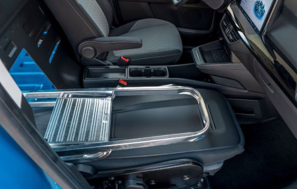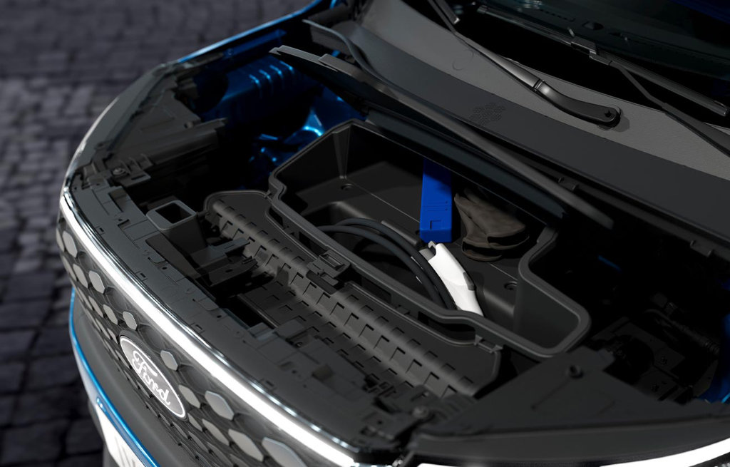 SUV-geïnspireerd ontwerp. Coast-to-coast-lichtbalk. En verchroomd rasterwerk aan het voorrooster. De E‑Transit Courier is ontworpen om hard te werken en de aandacht te trekken, met een kofferbak met capaciteit tot 44 l aan de voorkant.